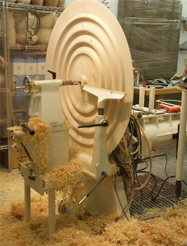 | On this shot, you can see the tool rest on which I hold the chisel while working the piece. At this point, I've shaped the face of the the platter. The platter now weighs about 50 pounds, half its original weight. |