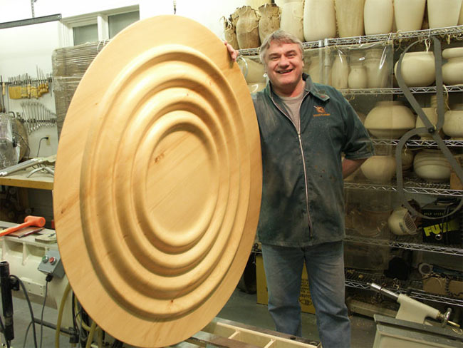 | Here's the finished wood platter. The next step is to apply a finish, in this case a painted motif. In the background, you can see some of my other work set out to dry. The drying process for all fine wood turnings is very complicated. They can't be allowed to dry too quickly or they will crack. Thinly turned pieces will dry within a week, whereas the thicker pieces will require upwards of a year to dry before finishing. |