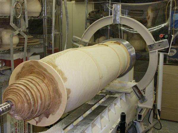 | Here the rough exterior shape of the vase has been made. Note the tail stock is still in place to bear the brunt of the weight which is now approximately 400 pounds. Next comes the removal of the interior. |