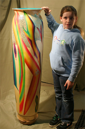 The size of the finished vase is shown by Katy, one of our friends. The vase has now been airbrushed with acrylic paint, carved, and lacquered.