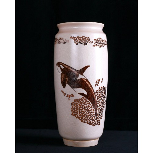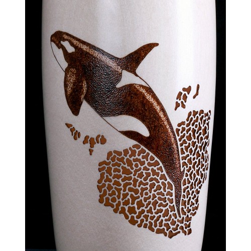 After turning very thin with the Large Captive Boring Bar, I embellished this vase using piercing to recreate the ocean's waves, overhead clouds and even a few splashes!  The jumping orca has been hand carved and then textured.