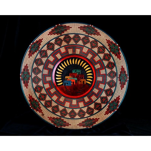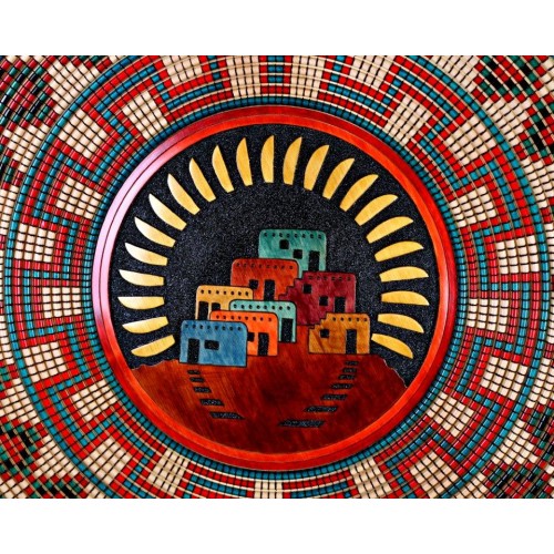 This Queen Charlotte Yellow Cedar wall hanging measures 36 inches in diamter. The outer embellishment has been inspired by the Papago and Navajo baskets of the American Southwest. A Hopi village surrounded by a stylized sun has been relief carved in the center.